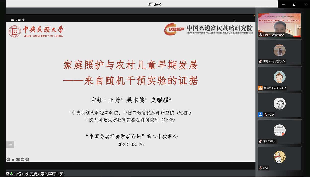 2022年3月26日,中国兴边富民战略研究院副院长白钰副教授在线参加“中国劳动经济学者论坛”第二十次季会并作题为“家庭照护与农村儿童早期发展——来自随机干预实验的证据”的报告。