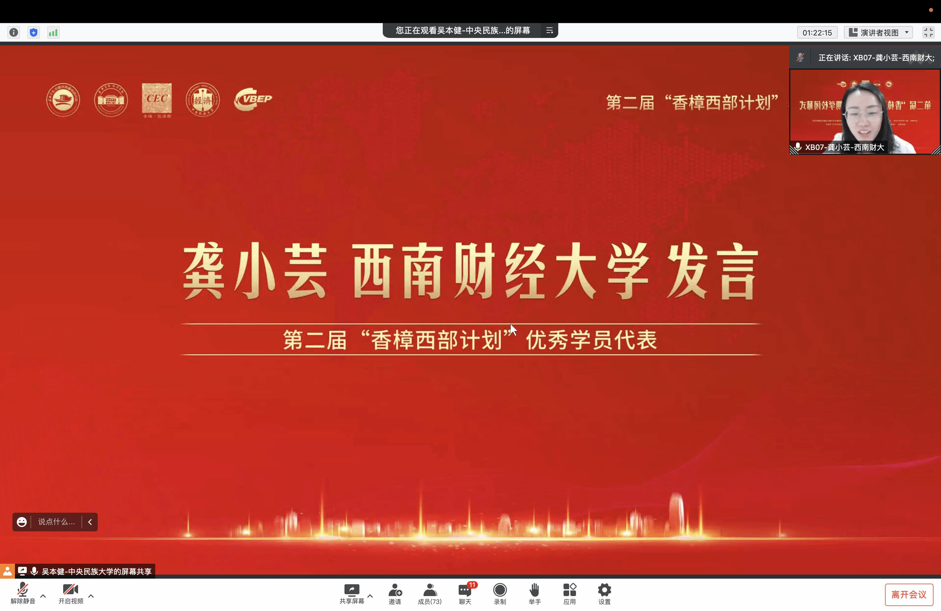 兰州大学的汪京、西南财经大学的龚小芸、西安财经大学的卢泓宇以及西安交通大学的张昭副教授作为第二届“香樟西部计划”优秀学员代表发言。