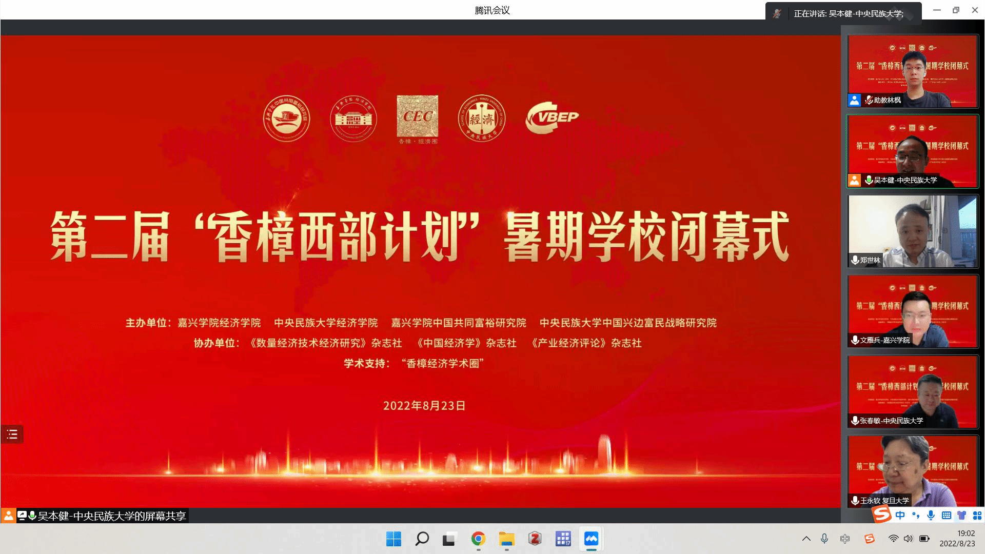 8月23日晚,第二届“香樟西部计划”暑期学校举行闭幕式,william威廉中文官网经济学院院长张春敏教授,嘉兴学院经济学院院长、嘉兴学院中国共同富裕研究院执行院长文雁兵教授,香樟经济学术平台主要发起人、中国社会科学院数量经济与技术经济研究所郑世林研究员,香樟经济学术平台学者代表、复旦大学经济学院王永钦教授,嘉兴学院经济学院副院长孙庆刚副教授,以及第二届“香樟西部计划”全体学员出席本次闭幕式。闭幕式议程主要包括老师致辞、公布优秀学员名单、助教代表及学员代表发言、师生交流研讨会,闭幕式由william威廉中文官网经济学院副院长吴本健教授主持。