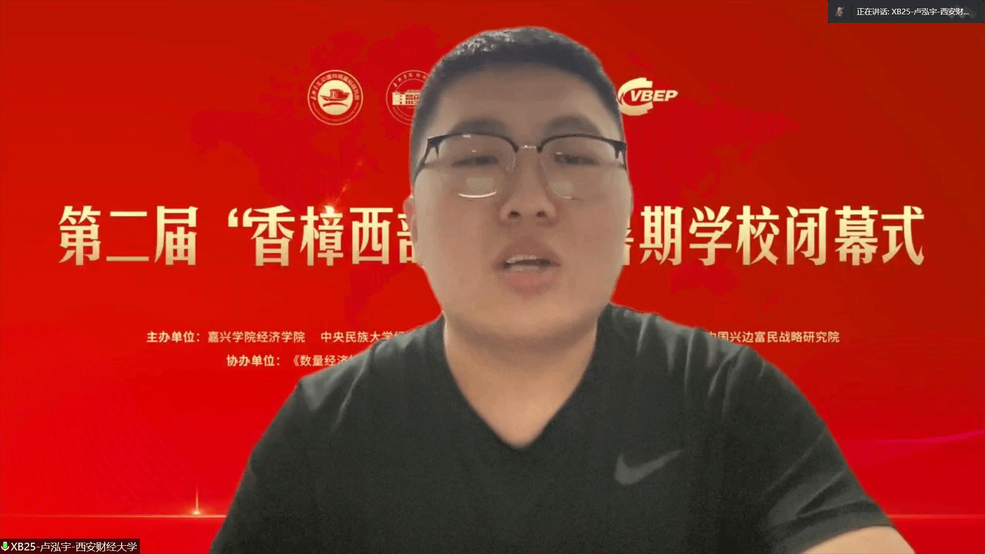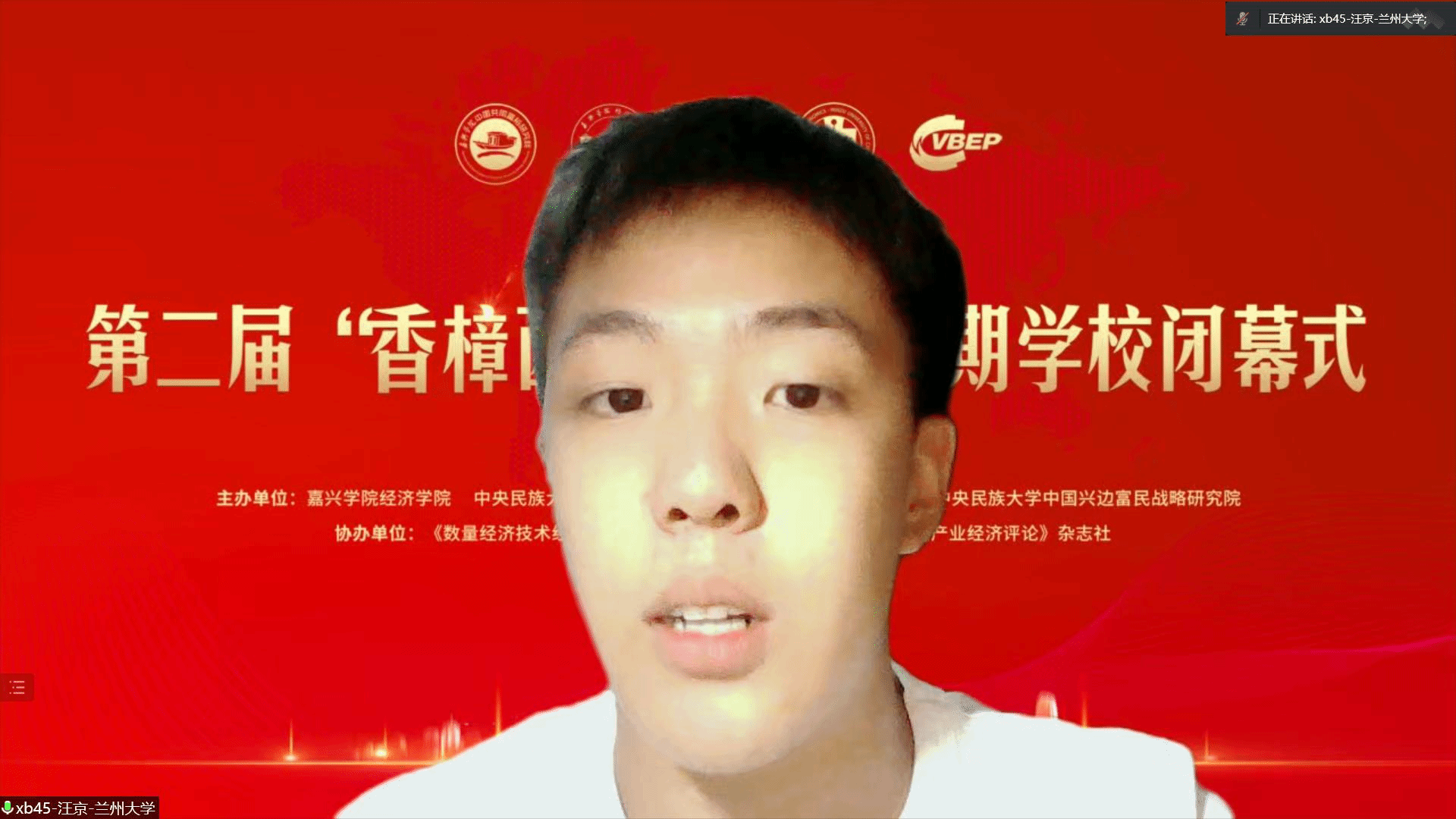 卢泓宇同学讲述了自己的学习经历,由于自己从工程管理跨专业到产业经济学,学术自信难以树立,随后通过不懈得学习与探索,才逐渐适应经济学的研究范式,暑期时间又有幸入选“香樟西部计划”,自己也十分珍惜这来之不易的学习机会。卢同学总结了自己参与此次香樟西部计划的所得:广交益友、学识延伸、思维升华。卢同学对“香樟西部计划”的办学提出两点建议:希望香樟平台可以将讲座或培训打造的更具特色,让更多研究领域的教师和同学参与进来;同时,还希望学员同各位老师达成长期的合作关系,而非一次性师生情谊,若各位老师将来有调研或实验项目需要学生参与,可以给予学员们一些机会等。最后,卢同学祝愿“香樟西部计划”越办越好,学员们产出更高质量的WilliamHill中文官方网站。