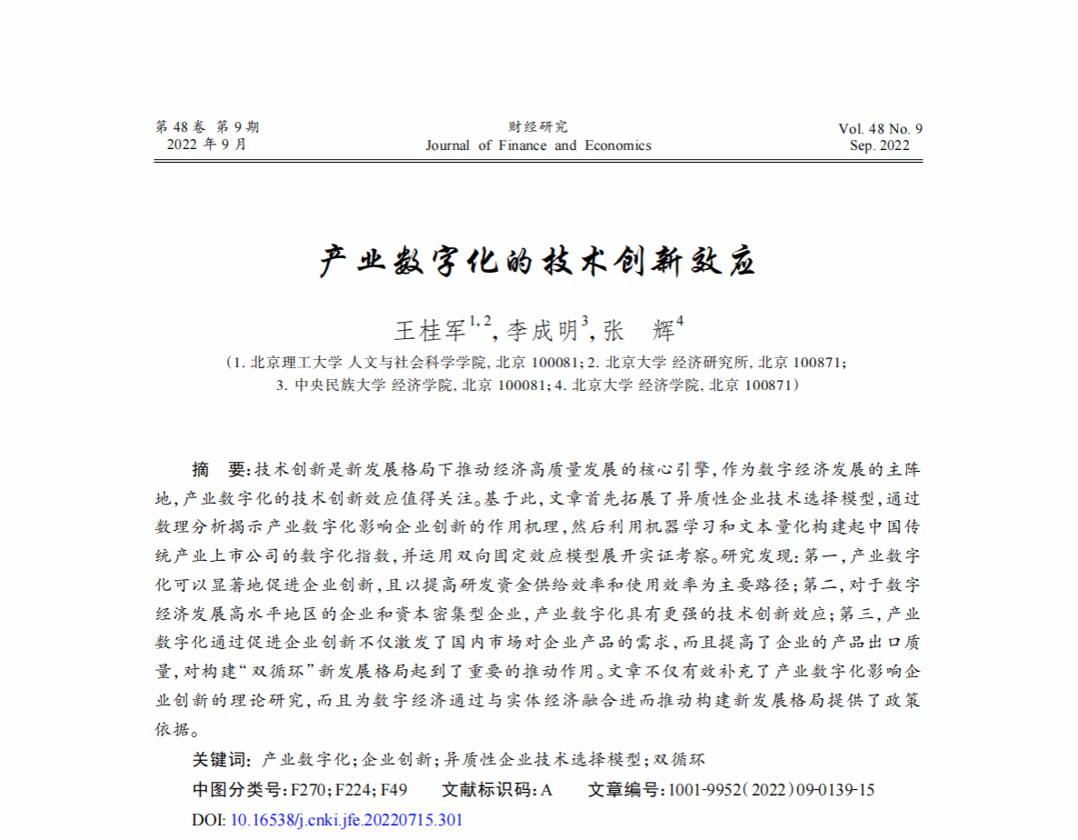 【摘要】技术创新是新发展格局下推动经济高质量发展的核心引擎,作为数字经济发展的主阵地,产业数字化的技术创新效应值得关注。基于此,文章首先拓展了异质性企业技术选择模型,通过数理分析揭示产业数字化影响企业创新的作用机理,然后利用机器学习和文本量化构建起中国传统产业上市公司的数字化指数,并运用双向固定效应模型展开实证考察。研究发现:第一,产业数字化可以显著地促进企业创新,且以提高研发资金供给效率和使用效率为主要路径;第二,对于数字经济发展高水平地区的企业和资本密集型企业,产业数字化具有更强的技术创新效应;第三,产业数字化通过促进企业创新不仅激发了国内市场对企业产品的需求,而且提高了企业的产品出口质量,对构建“双循环”新发展格局起到了重要的推动作用。文章不仅有效补充了产业数字化影响企业创新的理论研究,而且为数字经济通过与实体经济融合进而推动构建新发展格局提供了政策依据。